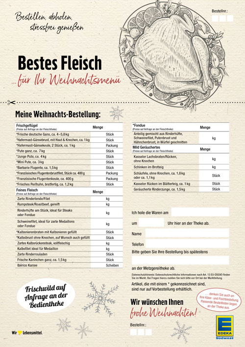 Sie wollen Ihre gewünschten Produkte für die Festtage bequem vorbestellen? Dann laden Sie sich hier unsere Weihnachts- und Silvester-Vorbestellzettel herunter, füllen Sie diese aus und geben Sie sie an der Bedientheke bei EDEKA Deckenbach ab. Abgabeschluss für Weihnachtsbestellungen ist der 13. Dezember, für Silvester kann bis zum 28. Dezember bestellt werden.